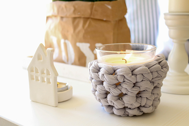 Fue así como me animé al mundo del trapillo y después de aprender el punto básico me animé a hacerme mis propios portavelas para decorar los centros de mesa de casa.