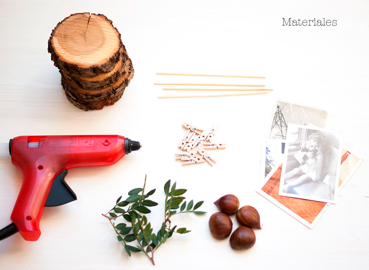 Cuando tengamos el soporte de nuestras fotos en su sitio se decora la parte inferior con ramitas de algún arbusto o pino para tapar la unión del palillo con la base. Las ramitas la pegáis con otra gotita de cola y por último, cerráis el conjunto pegando una castaña, por ejemplo: