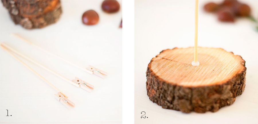 Comenzamos cortando los palillos de madera a 15cm. Pegamos en ellos con una gotita de cola caliente las pinzas como se puede ver en la imagen 1. Después pegamos el palito a nuestra base de madera con otra gota de cola caliente igual que podéis ver el imagen 2.