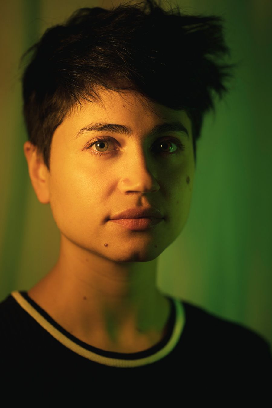 En la primera foto con dos flexos laterales que hemos forrado con los filtros: uno, más dirigido hacia la cara, con celofán naranja; y el otro, con uno verde que nos ha servido sobre todo para colorear el fondo.