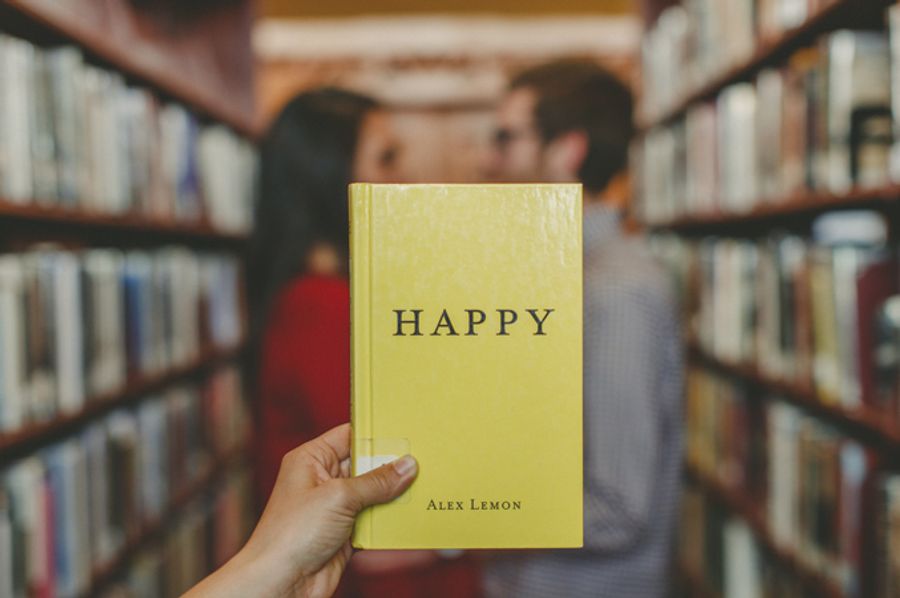 Incorporar elementos a tus fotos puede hacer que sean mucho más originales. Por ejemplo, un libro que haga referencia a lo felices que sois. Tendréis que ceder un poco de protagonismo, pero la foto quedará muy divertida.
