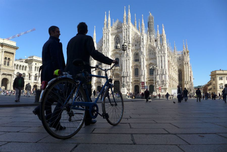 En la foto del Duomo de Milán los ciclistas no están en el centro de la acción y, sin embargo, están justo en el lado desde donde incide la luz del sol, de manera que resulta un contraluz lateral, en vez del clásico contraluz frontal.