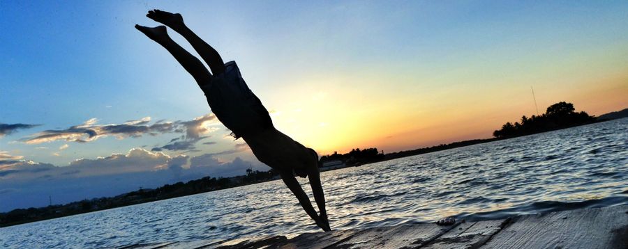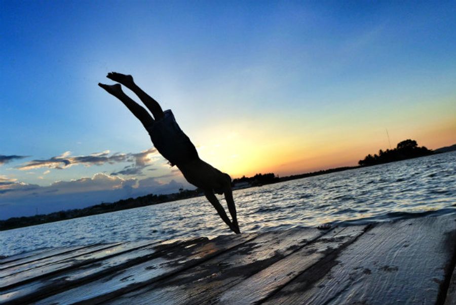 Por ejemplo en la foto del niño saltando al agua se ha buscado el momento exacto en el que la luz del sol siluetea el cuerpo. Se ha usado una velocidad rápida para congelar la acción y el ajuste de exposición ha saturado los colores del paisaje.