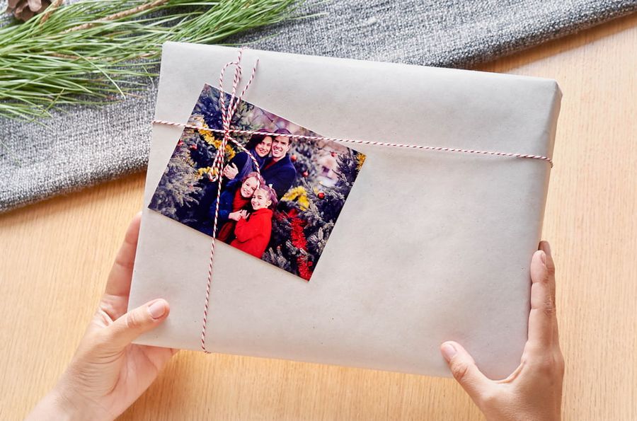 Si vas a dejar los regalos bajo el árbol, una forma diferente de que se sepa de quién es cada regalo es envolver regalos y colocar fotos impresas en la parte exterior del envoltorio.
