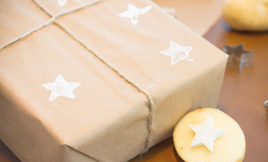 Para envolver regalos de forma bonita y original, elige un papel liso, y escoge el patrón que quieres que tenga tu papel. Luego, crea tu propio sello con una patata y un cuchillo. Coge patatas de la cocina y recórtalas con un cuchillo con la forma que quieras como aparece en la imagen. Crea diferentes patrones y úsalos con distintos colores. Tendrás el envoltorio con los diseños más personales. ¡Envolver regalos de forma original está en tus manos!