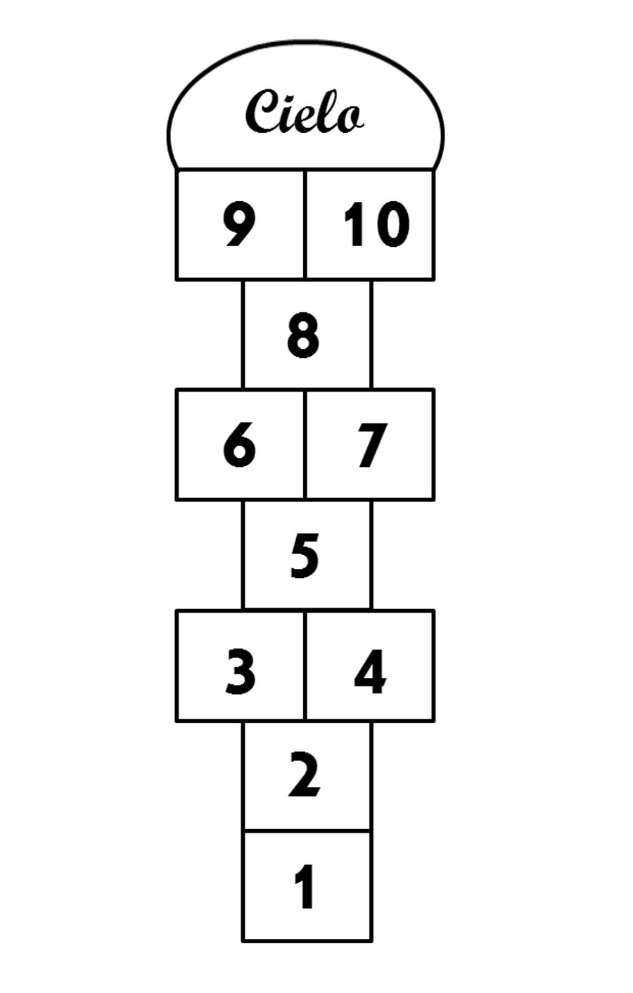 - La rayuela. Se hace un dibujo en la arena o en el suelo con tiza formando plataformas con números. Para comenzar a jugar se tira una piedra en el número 1, intentando que caiga dentro del número y sin tocar las rayas del cuadro. Luego se tiene que recorrer la rayuela dando saltos a la pata coja hasta llegar al número 10 o cielo. Se tiene que repetir por cada número del dibujo.