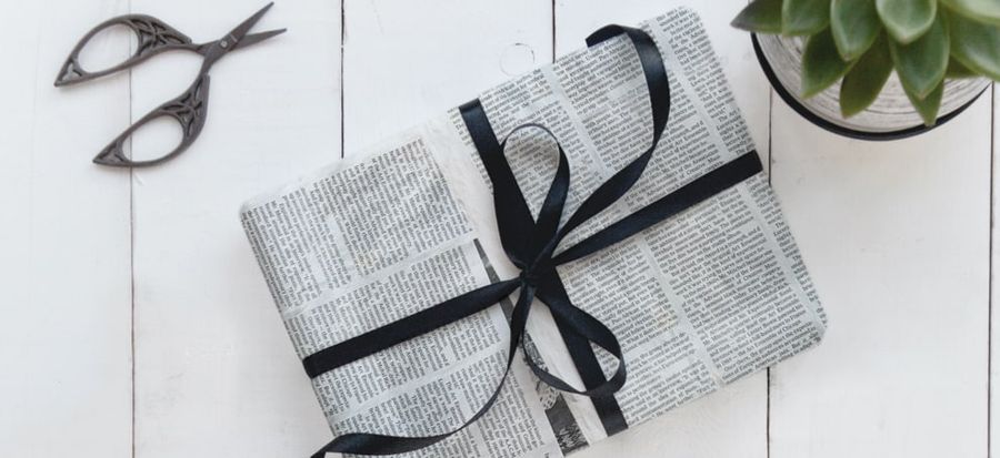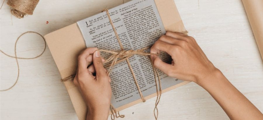 Esta es una forma muy sencilla para los que se preguntan cómo regalar un libro de forma original si tienes poco tiempo. Solo necesitas papel de diario y un cordel para dejar el envoltorio perfecto.