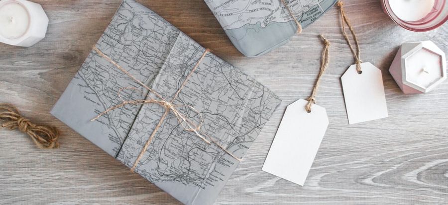 Esta es una idea muy original para envolver un libro o guía de viajes e, incluso, un diccionario de una lengua extranjera. Puedes comprar papel de envolver con el dibujo de un mapa o usar una guía turística o plano.