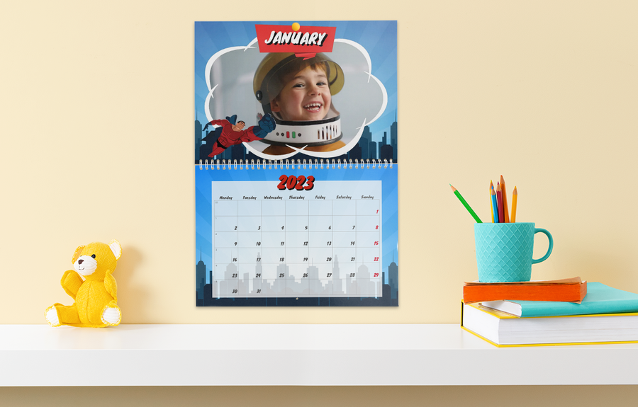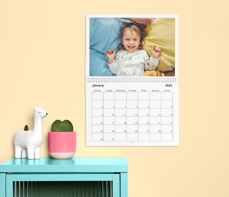 Lo siguiente es fácil: elige el tamaño de tu calendario. Tienes varias opciones entre las que elegir: A3, A4, A4 doble y cuadrado. Si no logras decidirte, piensa dónde colgarás el calendario. Para espacios abiertos, el favorito de nuestros clientes (el A4 doble) puede ayudar a crear un punto central en tu espacio y mostrar mejor tanto tus fotos favoritas como tus eventos. Para espacios más pequeños, como tu despacho o encima del escritorio, un calendario cuadrado o A4 ocupa menos espacio.