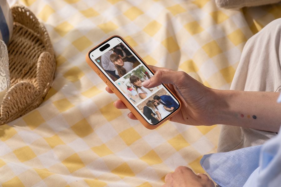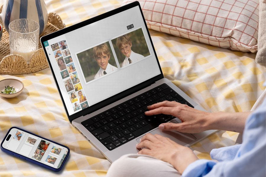 Crear tu álbum de comunión es más fácil de lo que crees. Puedes subir fotos directamente desde redes sociales, móvil, ordenador o tableta. Y aquí va un truco: con nuestra transferencia de fotos del móvil (para Mac y Windows), pásalas al ordenador escaneando un código QR. ¡Así de rápido!