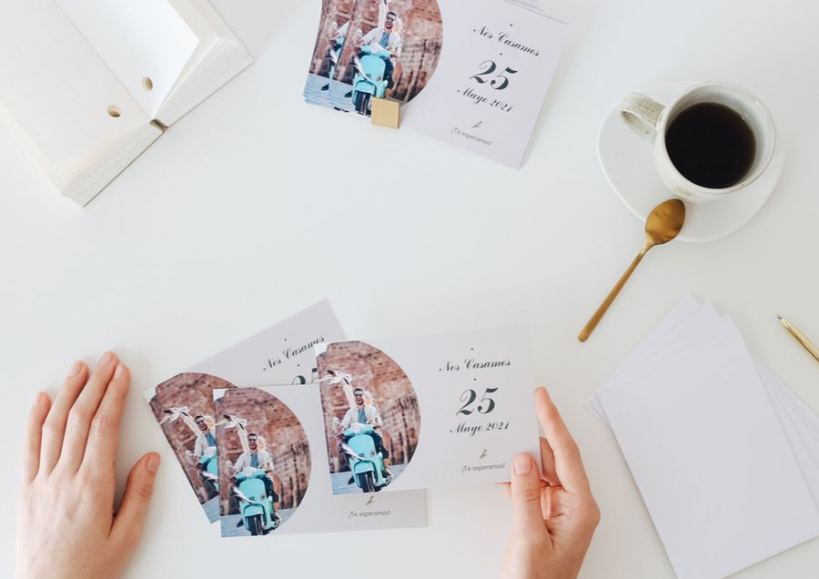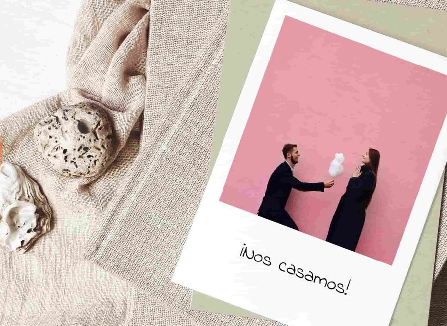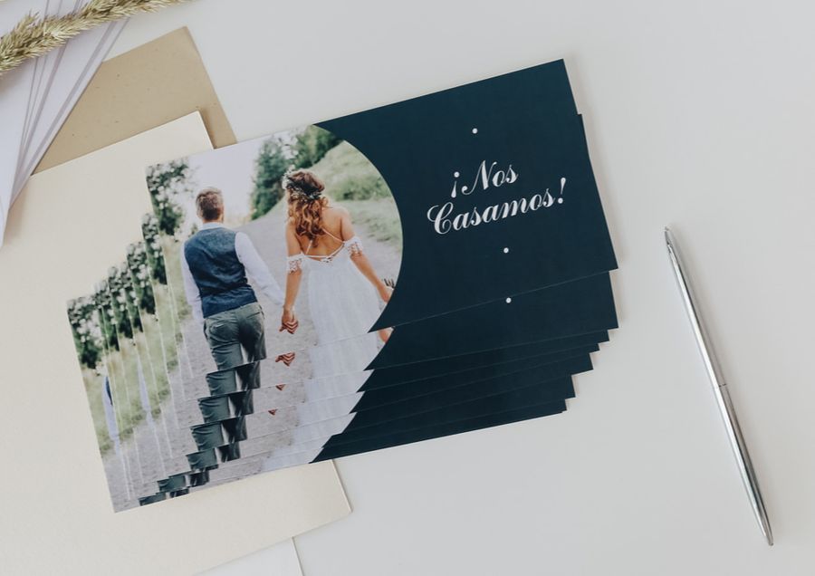 Recomendación 🔮: puedes crear tus propias invitaciones de boda directamente desde aquí. Podrás elegir entre tarjetas rectangulares, cuadradas o panorámicas, plegables o sin plegar. Te llegarán en paquetes de 10 tarjetas + 10 sobres blancos relucientes en una caja de tarjetas de colores. ¡Sorprende a tus invitados con detalles de boda únicos desde el primer momento!