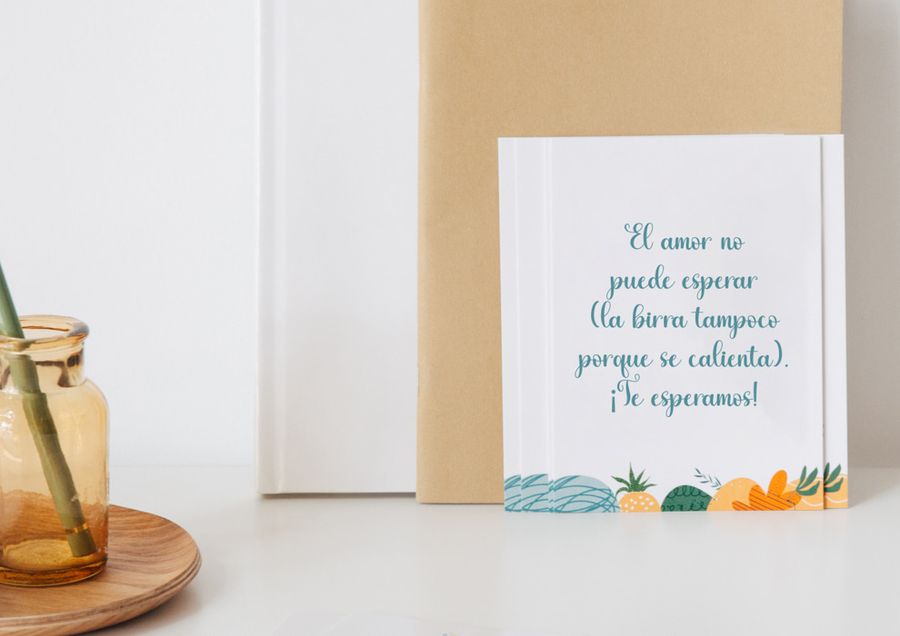 Si os queréis saltar las normas más tradicionales o combinar el contenido habitual con otros textos, podéis hacerlo incluyendo alguna frase graciosa en vuestras invitaciones y añadir ilustraciones, fondos y colores creando vuestras invitaciones de boda aquí. Te dejamos algunos ejemplos: